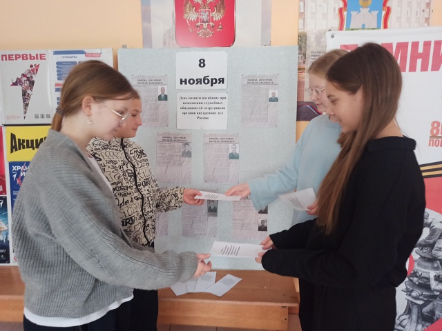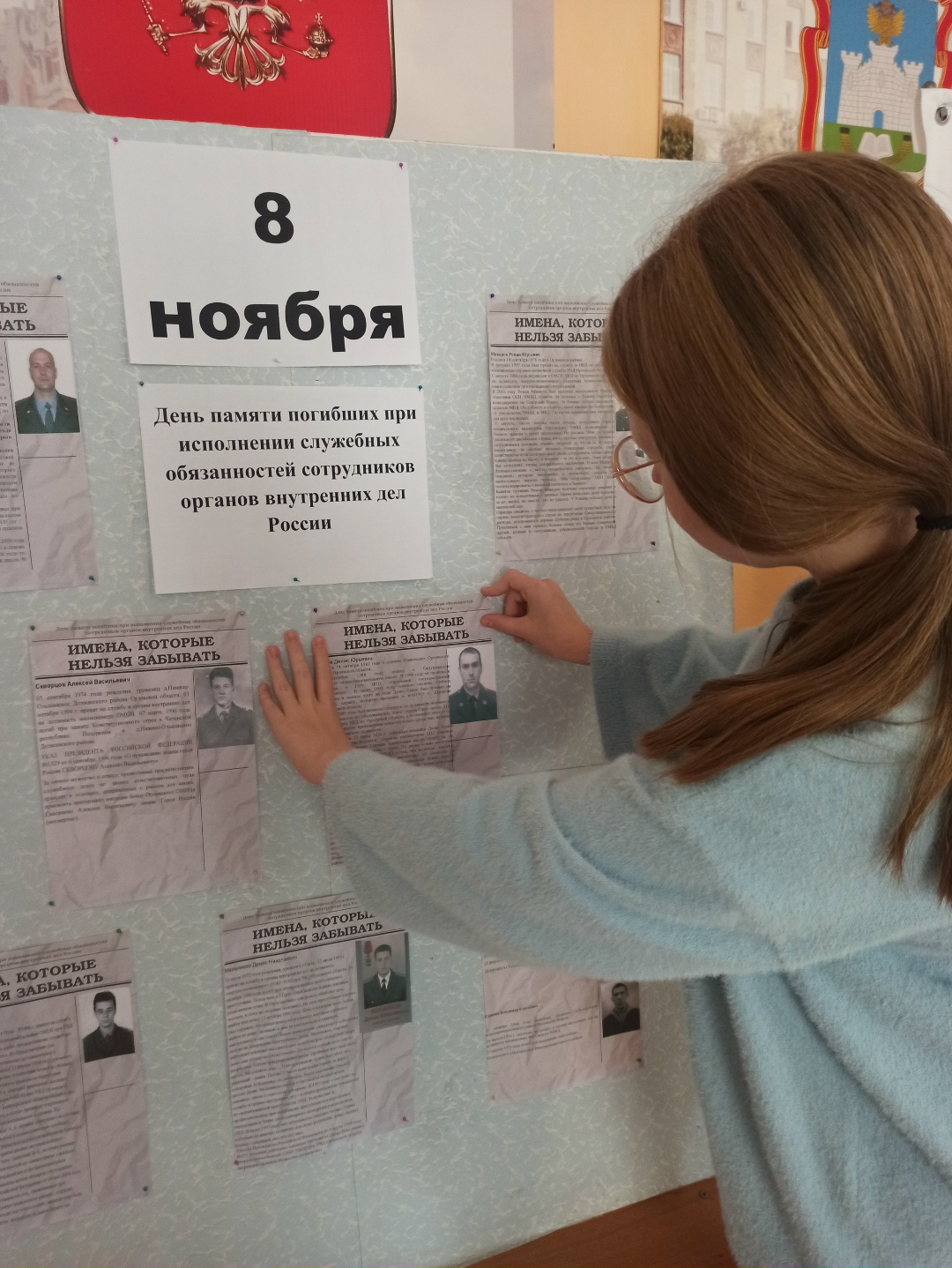 Советник директора по воспитанию Полякова А.В. совместно с обучающимися школы оформили информационный стенд «Имена, которые нельзя забывать», на котором разместили информацию о подвигах погибших при исполнении служебных обязанностей сотрудников органов внутренних дел Орловской области. Также были подготовить информационные листовки о героях региона, которые отдали свою жизнь, выполняя служебный долг.